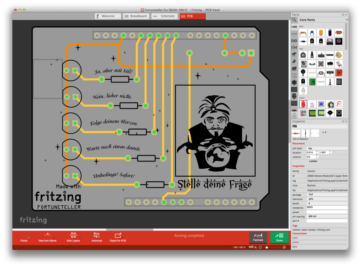 Fritzing ist eine Software um elektronische Schaltungen auf dem Computer zu erstellen. Die benötigten Bauteile können über das Programm aus dem Internet heruntergeladen werden. Diese Elemente werden auf einer Steckplatine untergebracht und so das eigene Projekt geplant und verwirklicht. Die Entwürfe können abschließend u.a. im .pdf-, .png-, .jpg-Format exportiert oder auf der Homepage von Fritzing veröffentlicht werden. Es ist ebenfalls möglich kostenpflichtig passende Leiterplatten zu bestellen. Praktisch ist die Möglichkeit eine Liste der Bauteile zu erstellen. Zur Programmierung des Arduino kann die integrierte Entwicklungsumgebung verwendet werden.